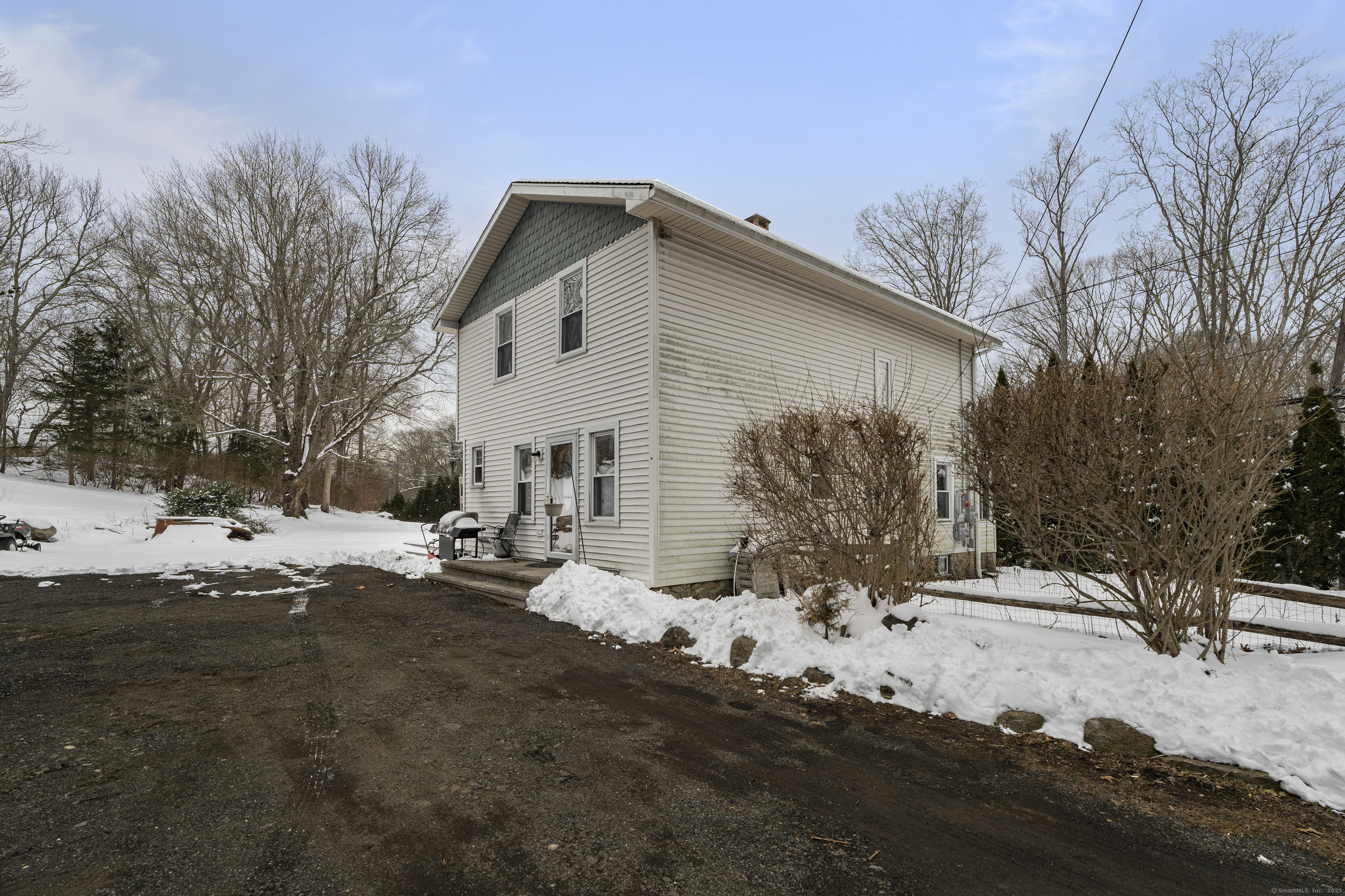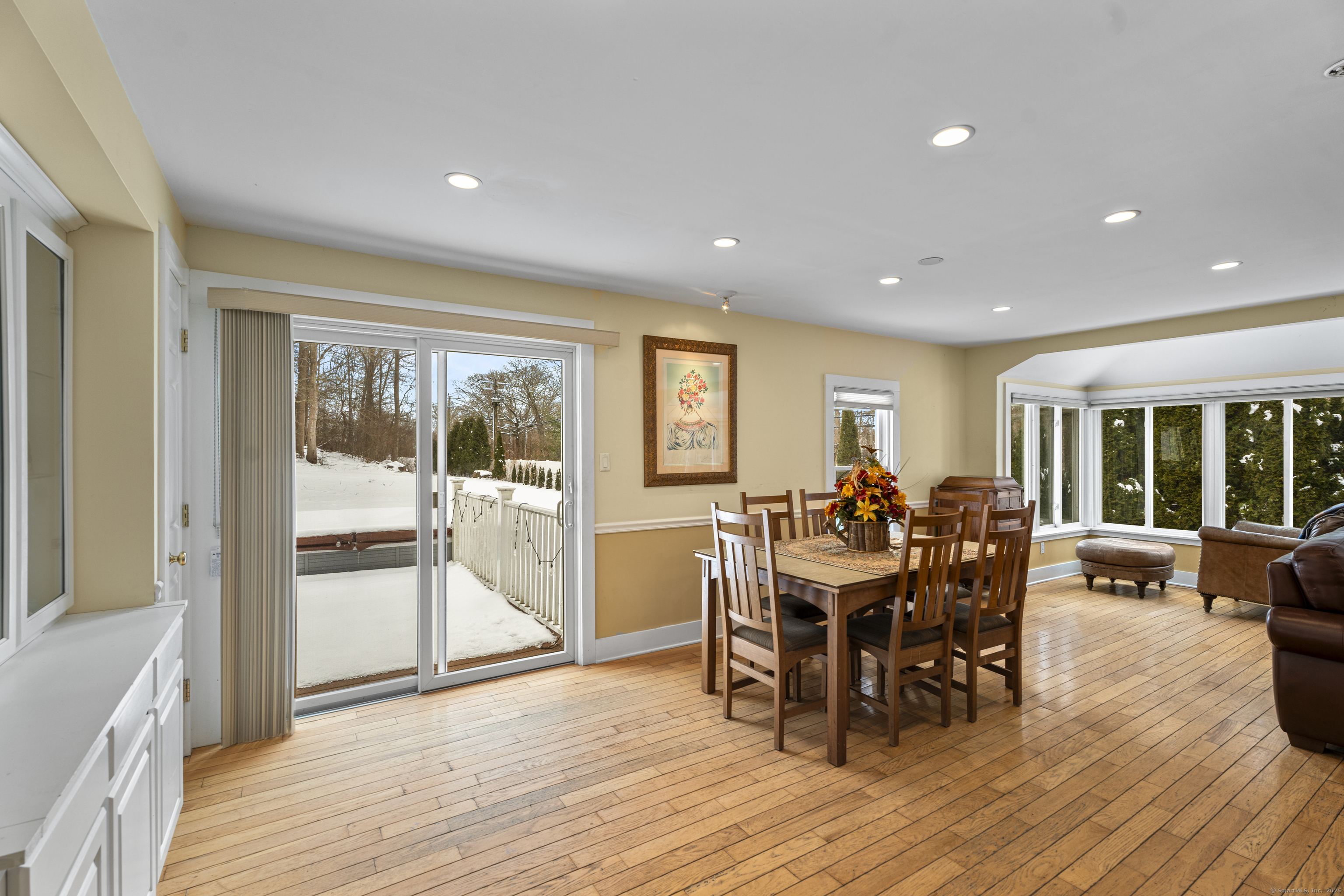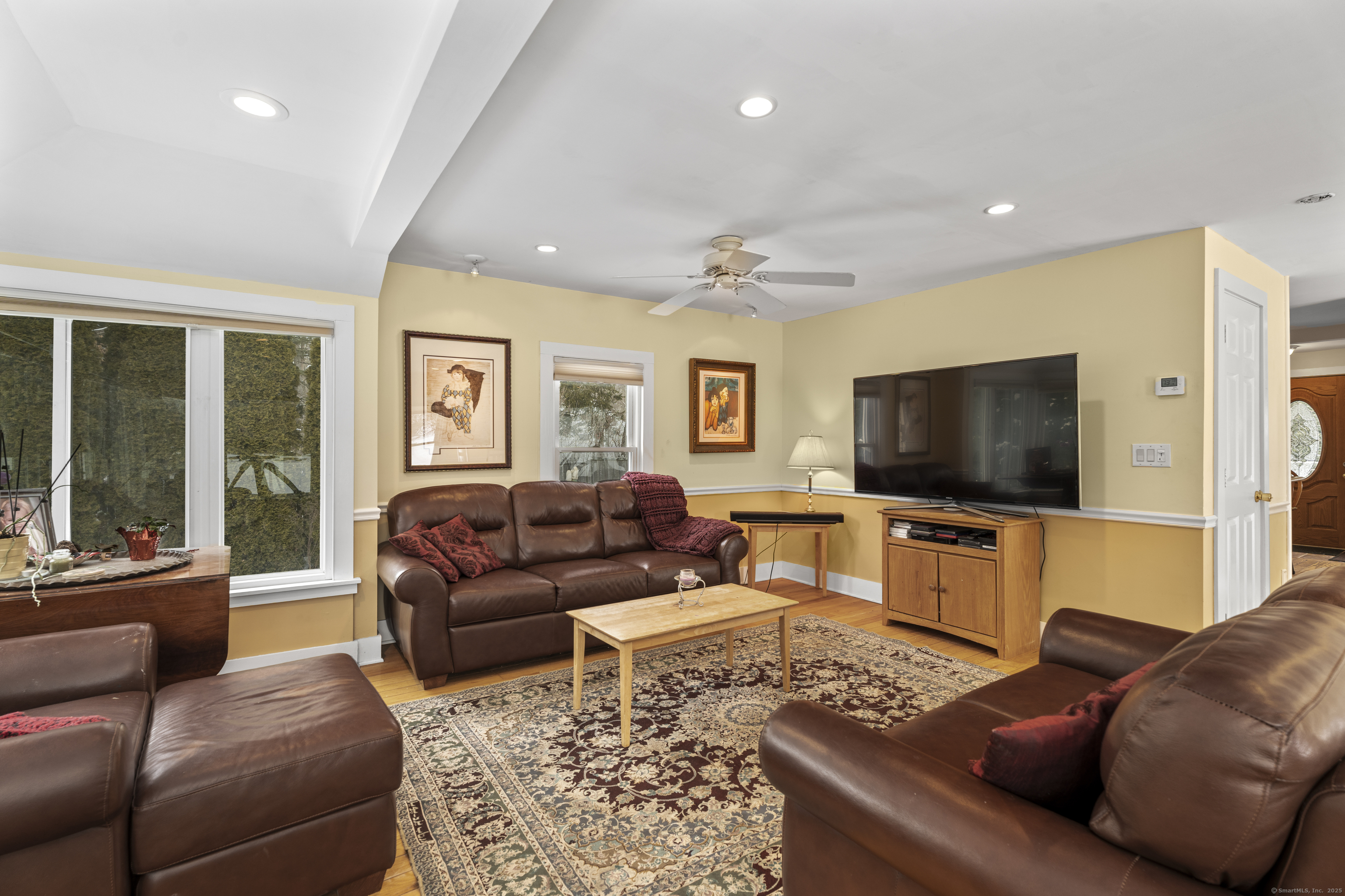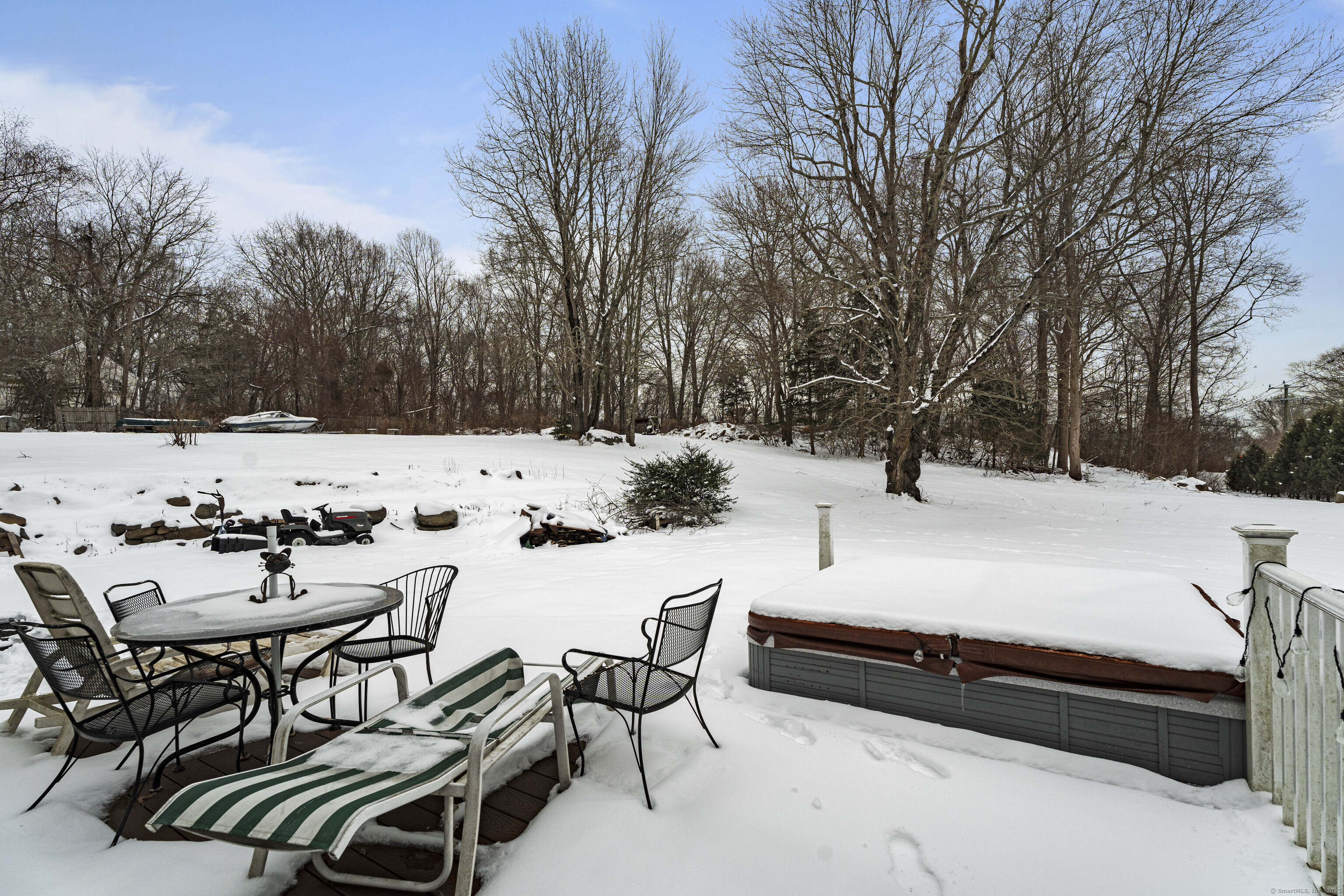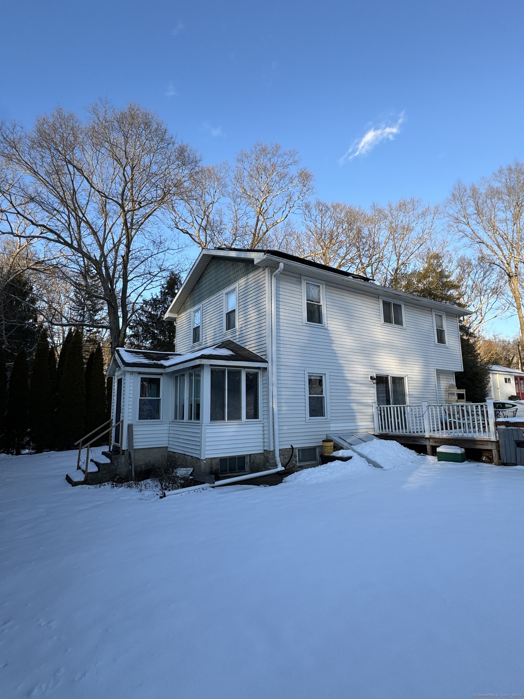 Welcome to this 3-bedroom home, ideally located in the heart of Madison-close to everything you need! As you enter, you are greeted by an open floor plan with hardwood floors throughout. The kitchen features a gas stove and center island and flows effortlessly into the dining area, which boasts built-in cabinetry perfect for storing your entertaining essentials. The family room, bathed in natural light thanks to its walls of windows surrounding the front door vestibule, creates a warm, inviting space. Sliding doors lead out to a low-maintenance Trex deck and hot tub, perfect for relaxing or entertaining. The main level also includes a convenient powder room and laundry area for added practicality. Upstairs, you'll find three comfortable bedrooms, each offering plenty of space, as well as a full bathroom complete with a soft-jetted air tub and separate tiled shower-ideal for unwinding after a long day. This home is equipped with natural gas heating, ensuring comfort and efficiency year-round. Additionally, with solar panels installed on a roof that is only 2 years old, this home offers enhanced energy efficiency. Set on a generous 1.5-acre corner lot, the property offers incredible potential, with a privacy fence and mature perennial trees that create a tranquil, park-like atmosphere. Additionally, an outbuilding on the property provides ample storage, and the driveway off Hunter's Trail offers easy access. Just a minute from I-95, this location is a commuter's dream.