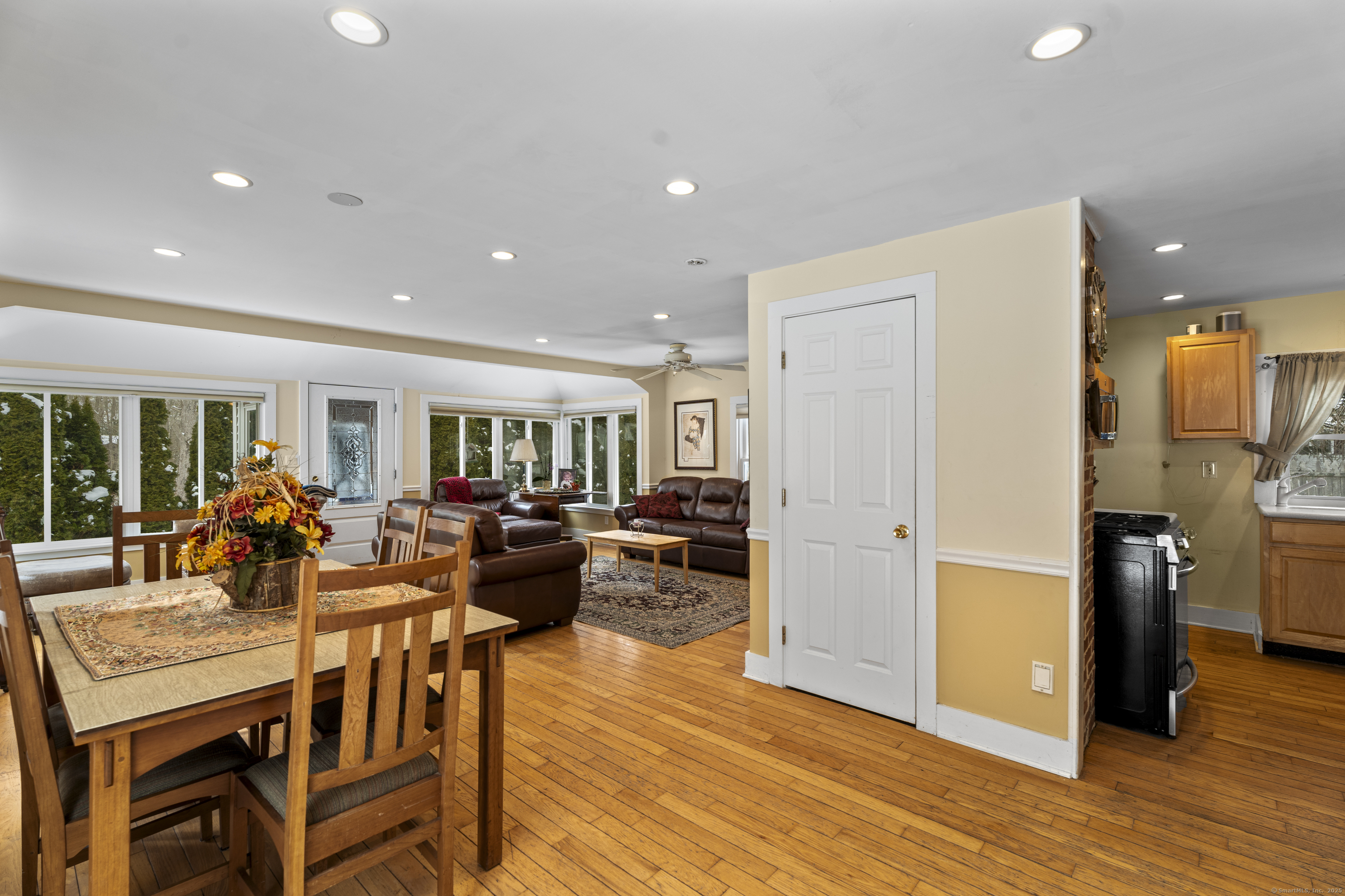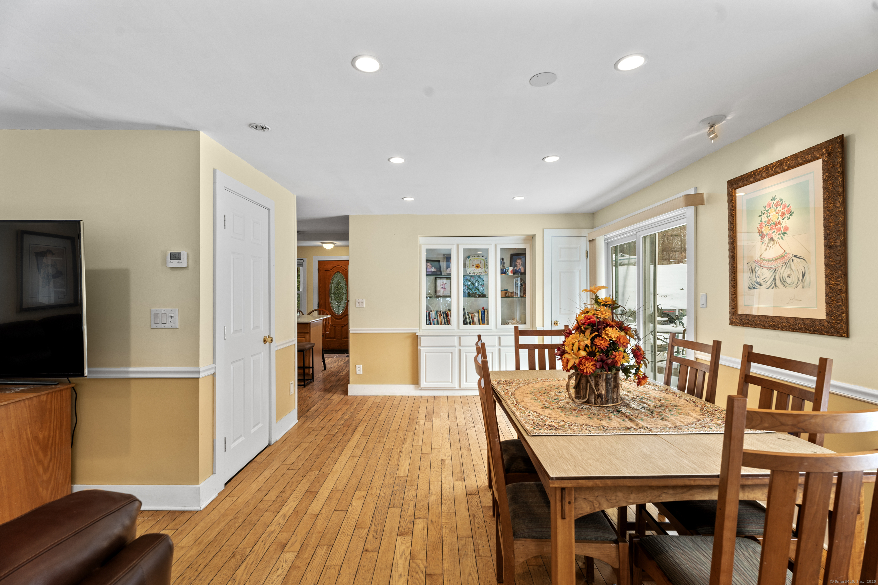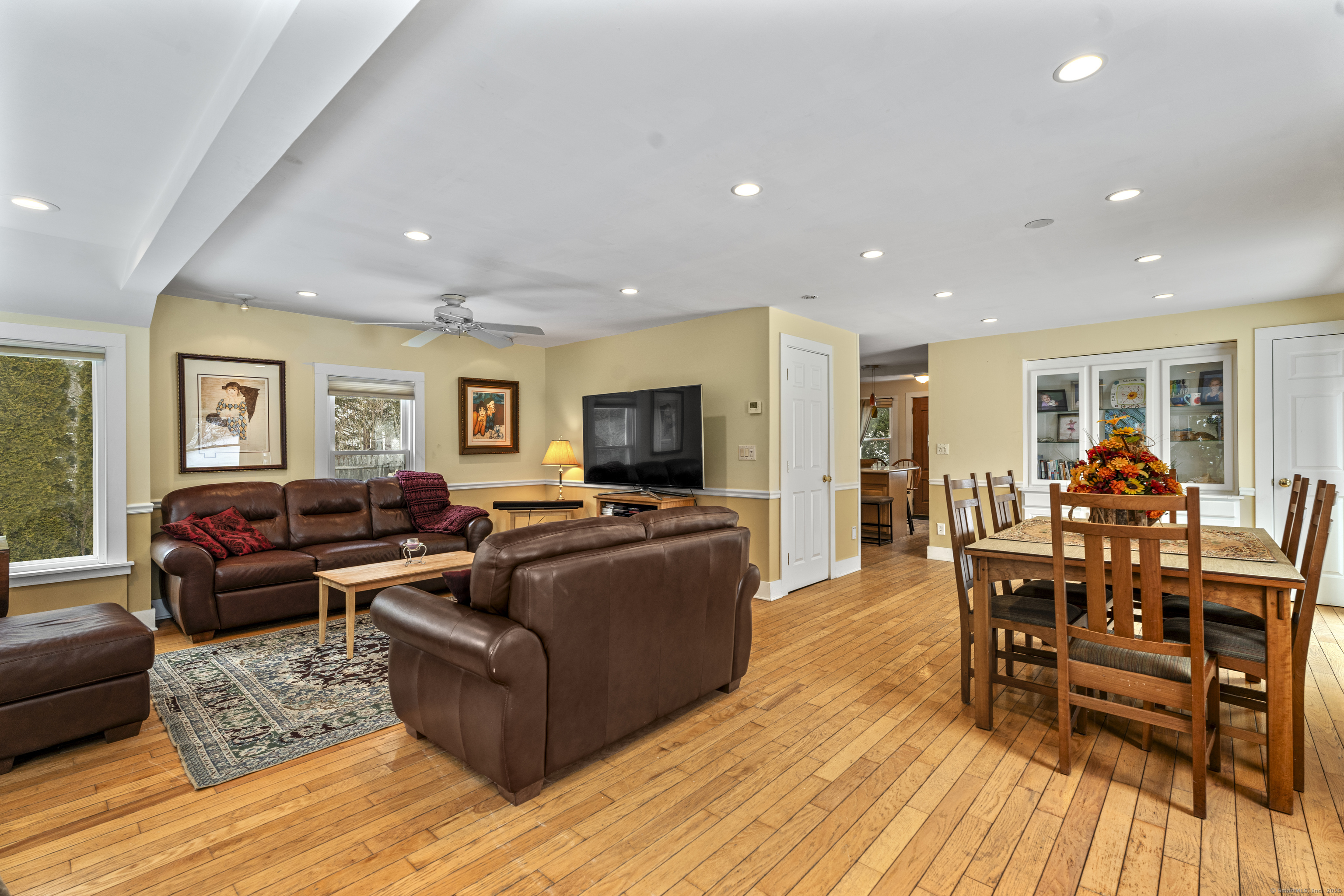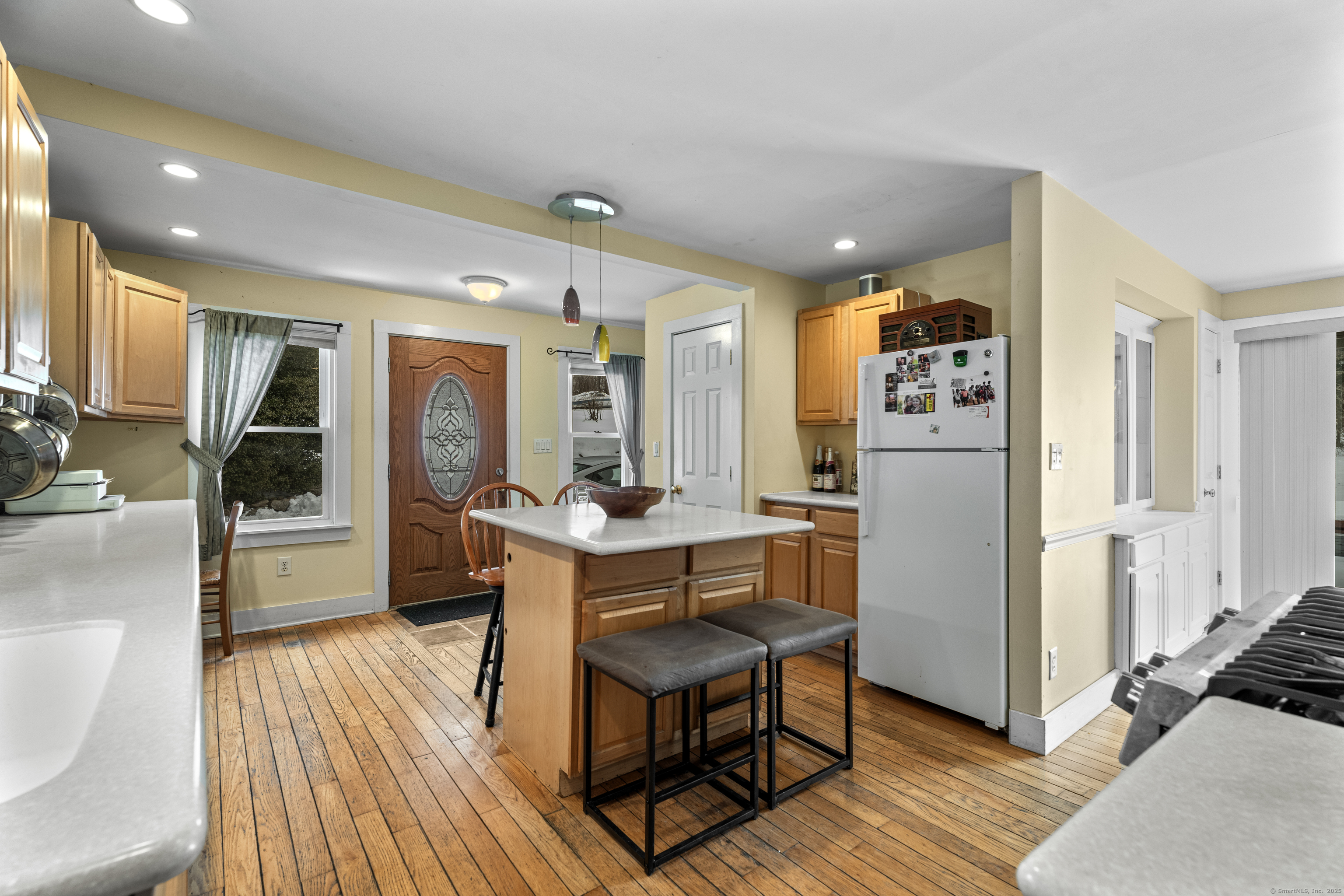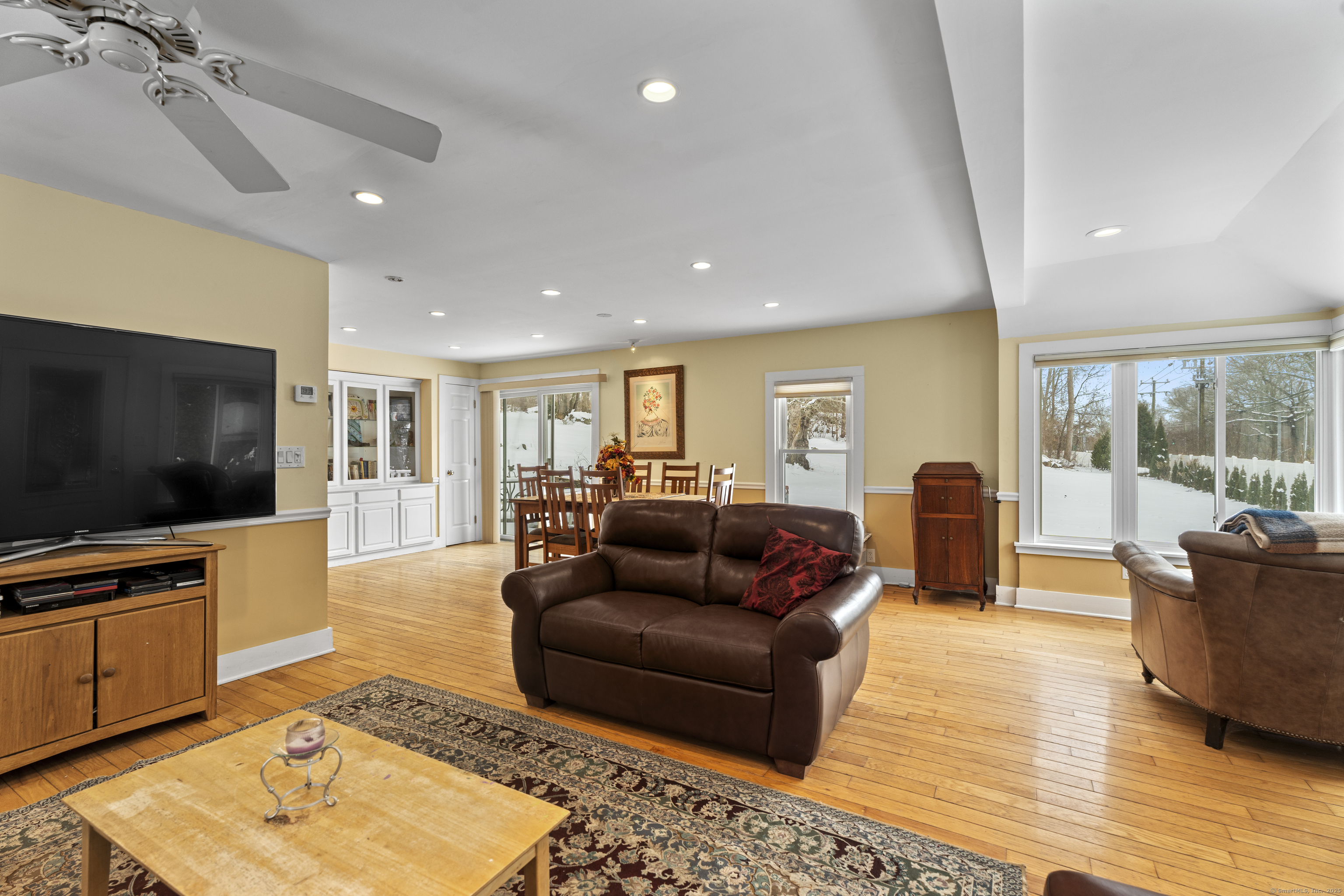 Welcome to this 3-bedroom home, ideally located in the heart of Madison-close to everything you need! As you enter, you are greeted by an open floor plan with hardwood floors throughout. The kitchen features a gas stove and center island and flows effortlessly into the dining area, which boasts built-in cabinetry perfect for storing your entertaining essentials. The family room, bathed in natural light thanks to its walls of windows surrounding the front door vestibule, creates a warm, inviting space. Sliding doors lead out to a low-maintenance Trex deck and hot tub, perfect for relaxing or entertaining. The main level also includes a convenient powder room and laundry area for added practicality. Upstairs, you'll find three comfortable bedrooms, each offering plenty of space, as well as a full bathroom complete with a soft-jetted air tub and separate tiled shower-ideal for unwinding after a long day. This home is equipped with natural gas heating, ensuring comfort and efficiency year-round. Additionally, with solar panels installed on a roof that is only 2 years old, this home offers enhanced energy efficiency. Set on a generous 1.5-acre corner lot, the property offers incredible potential, with a privacy fence and mature perennial trees that create a tranquil, park-like atmosphere. Additionally, an outbuilding on the property provides ample storage, and the driveway off Hunter's Trail offers easy access. Just a minute from I-95, this location is a commuter's dream.